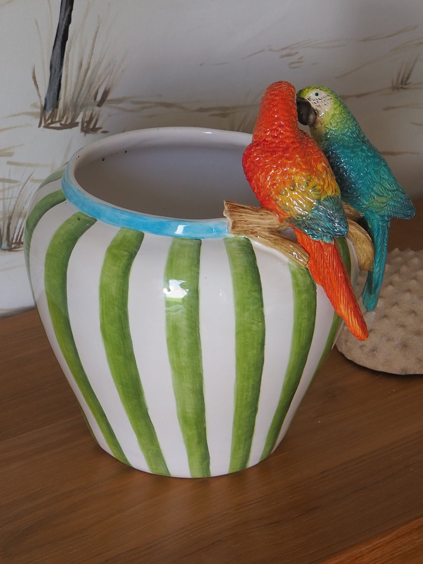 Le vase Amado a été fabriqué et peint à la main dans un atelier de céramique à l'ouest de Sao Paulo. Avec deux perroquets aux couleurs saillantes, il apportera une touche unique à votre maison.